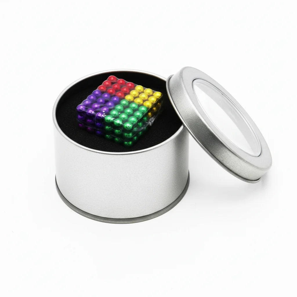 Each enchanting Stimsy set unveils 216 vibrant, rainbow-colored magnetic spheres, meticulously arranged in a perfect cube. These treasures arrive nestled within a sleek, round silver metal tin with a clear lid, ensuring elegant storage and effortless portability. It's a complete toolkit for inspiring calm, focus, and a spectrum of creative possibilities, ready to accompany you on your mindful adventures.